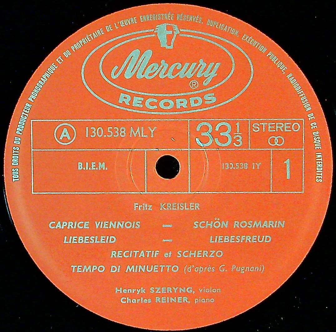 商品コード:1400-018[MERCURY] H.シェリング(vn)/ クライスラー:Vn小品集(全13曲)/ウィーン奇想曲, 美しきロスマリン, 愛の喜び, 愛の悲しみ, 中国の太鼓, ロンディーノ 他