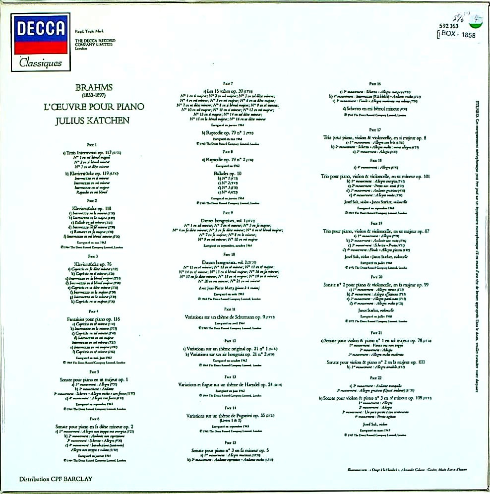 商品コード:BOX-1858[仏DECCA] J.カッチェン(pf) J.スーク(vn) J.シュタルケル(vc) / ブラームス:Pf作品全集(室内楽作品を含む)