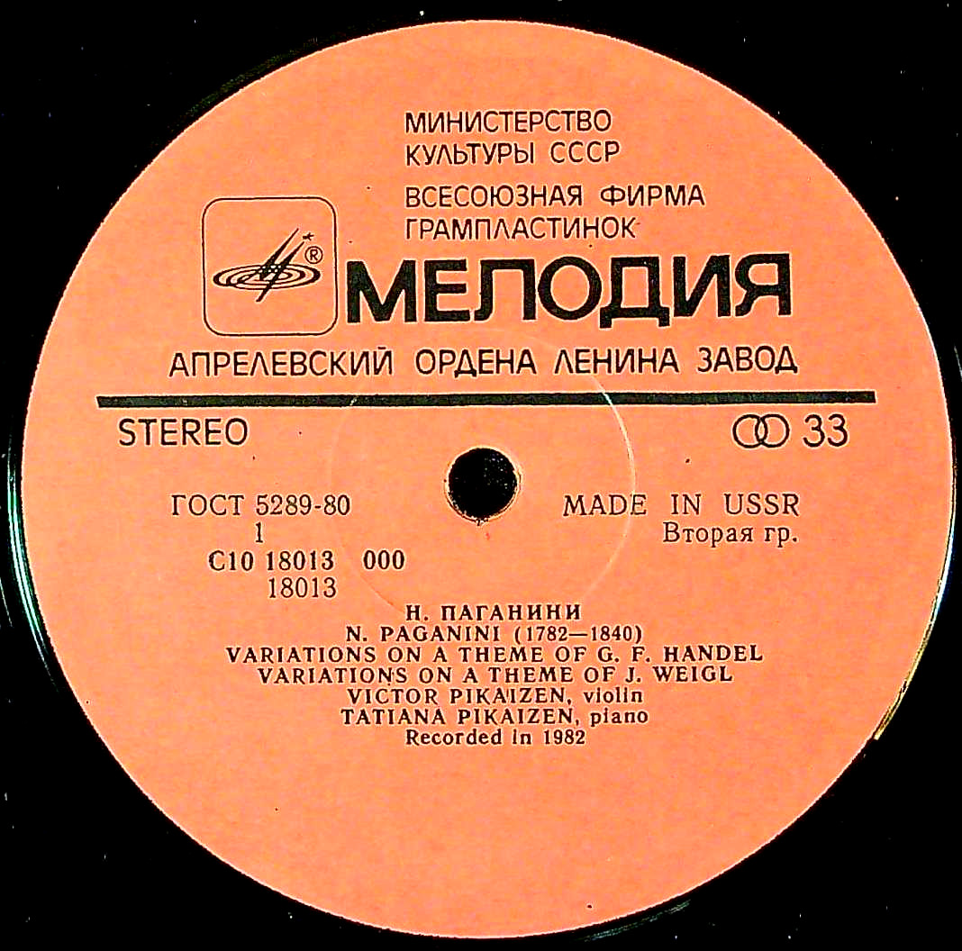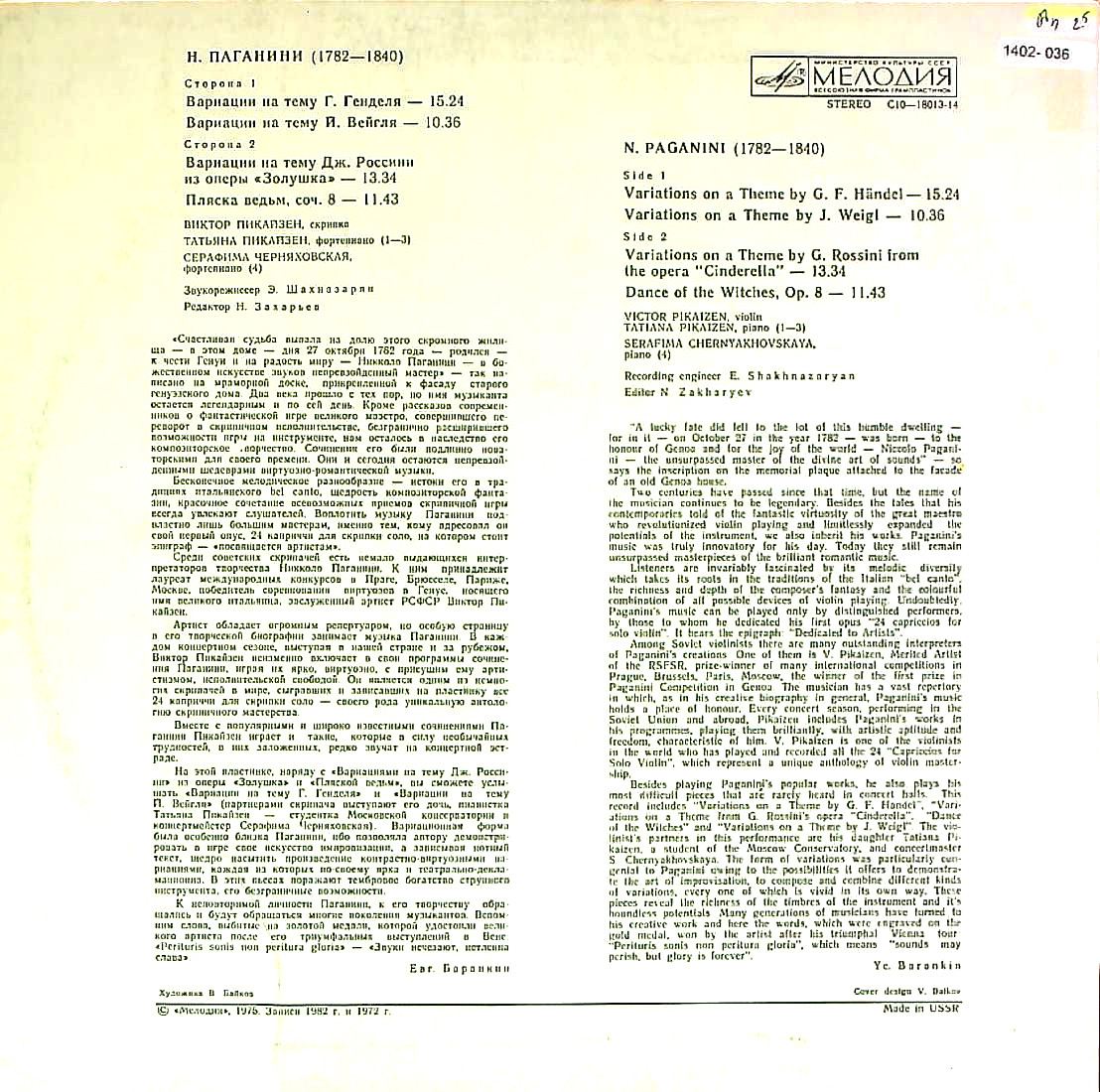商品コード:1402-036n[MELODIYA] V.ピカイゼン(vn)/ パガニーニVn作品集/アルミーラ変奏曲, ヴァイグル変奏曲, シンデレラ変奏曲Op.12, 魔女たちの踊りOp.8