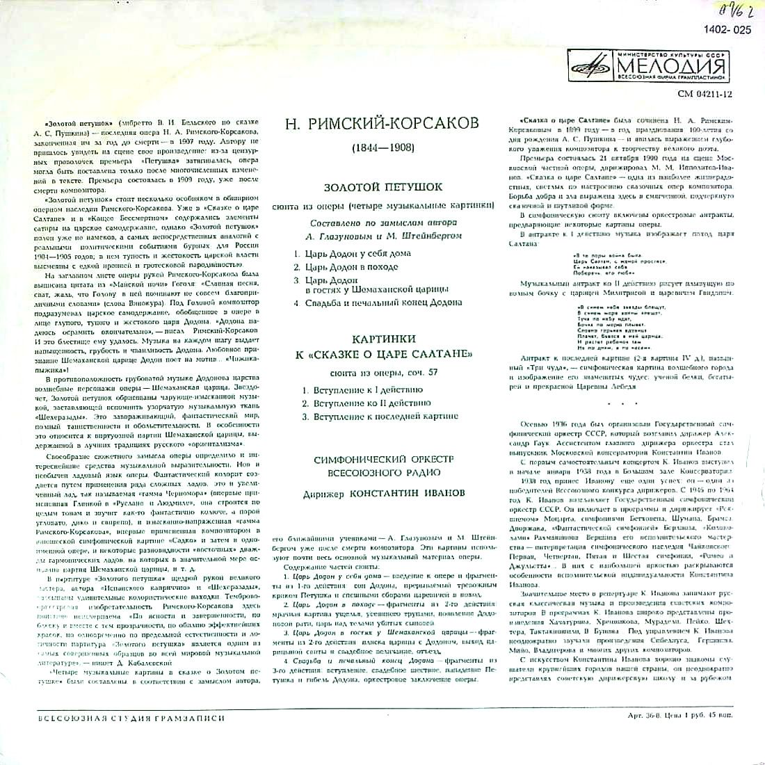 商品コード:1402-025n[MELODIYA] K.イワノフ/ リムスキー・コルサコフ:歌劇「金鶏」組曲(全4曲)