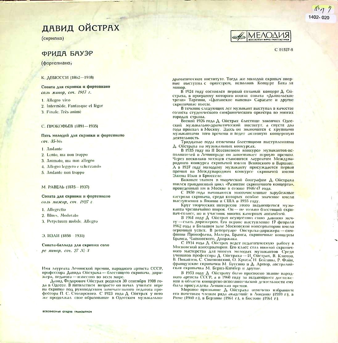 商品コード:1402-020n[MELODIYA] D.オイストラフ(vn)/ ドビュッシー:Vnソナタ ト短調, プロコフィエフ:5つのメロディーOp.35bis , ラヴェル:Vnソナタト長調, イザイ:バラードOp. 27-3