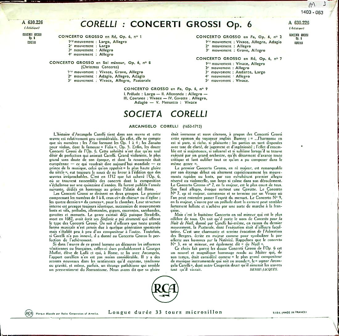 商品コード:1403-063[RCA] ソチエタ・コレッリ合奏団 / コレッリ:合奏協奏曲Op.6(全12曲/抜粋5曲)/第1番&2番, 7~9番