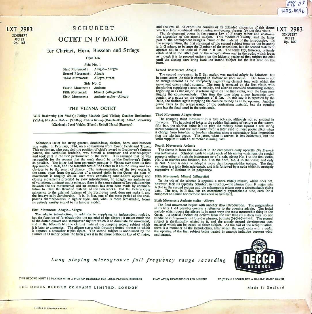 商品コード:1403-044b[DECCA] ウィーン八重奏団 / シューベルト:八重奏曲D.803