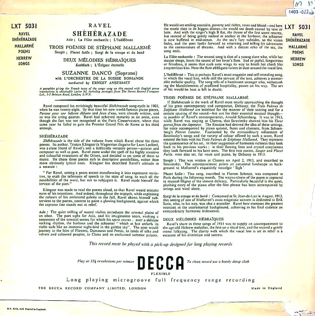 商品コード:1403-022nb[DECCA] S.ダンコ(s) / ラヴェル:シェヘラザード, マラルメの3つの詩, 2つのヘブライの歌