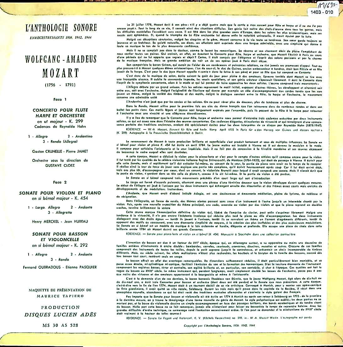 商品コード:1403-010[L'Anthologie Sonore] G.クロエ指揮 F.ウーブラドゥ(Fg) 他/ モーツァルト:Fl&Hp協奏曲調K.299, Vnソナタ40番K.454, Fg&VcソナタK.292