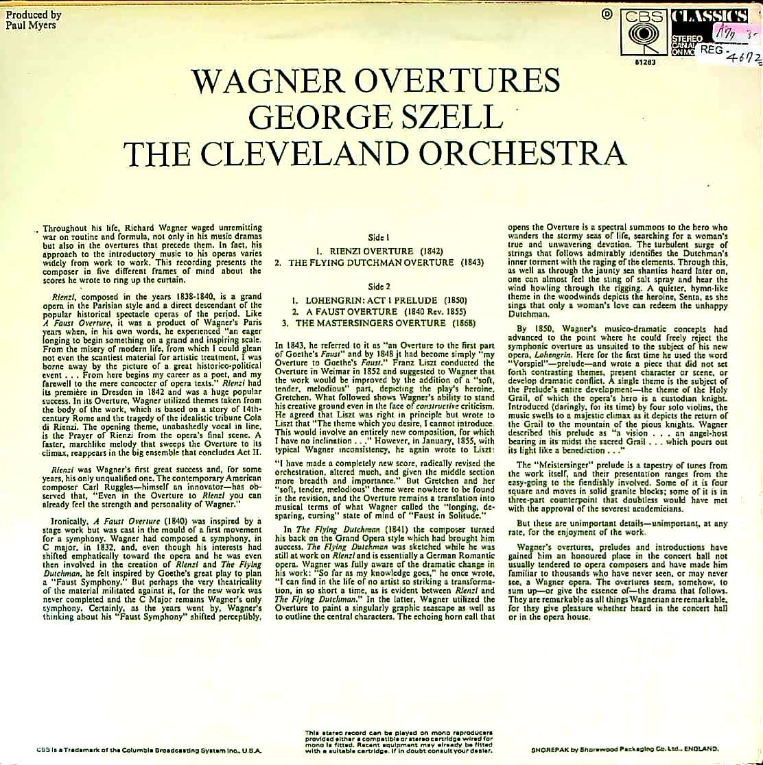商品コード:REG-4672t[英CBS] G.セル/ 「ワーグナー:序曲・前奏曲集」ファウスト序曲, リエンツィ, オランダ人, ローエングリン~第1幕への前奏曲, マイスタージンガー