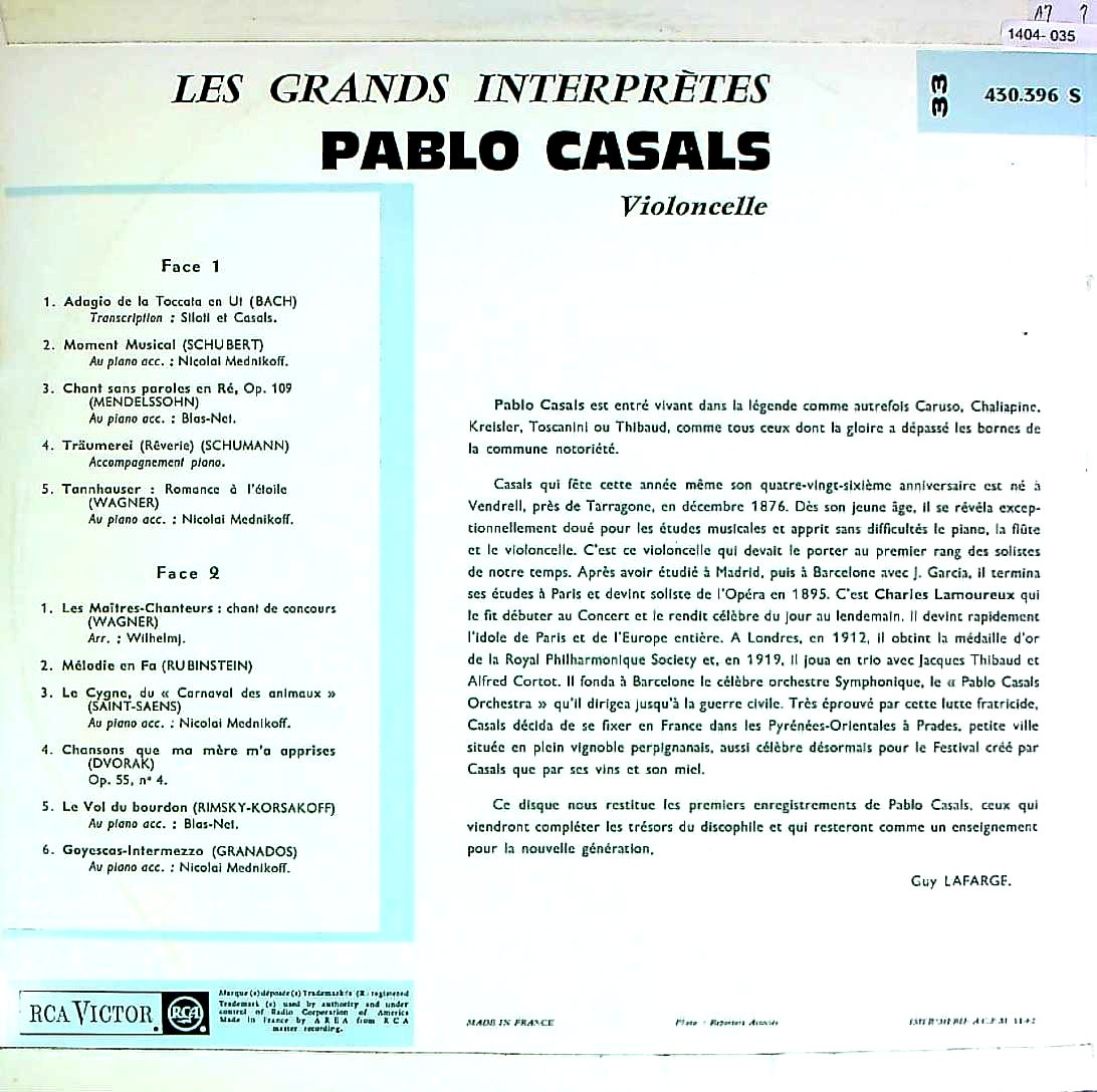 商品コード:1404-035[RCA] P.カザルス(vc) / Vc小品集/バッハ, シューベルト, メンデルスゾーン, シューマン, ワーグナー, ルビンシテイン, サン・サーンス 他