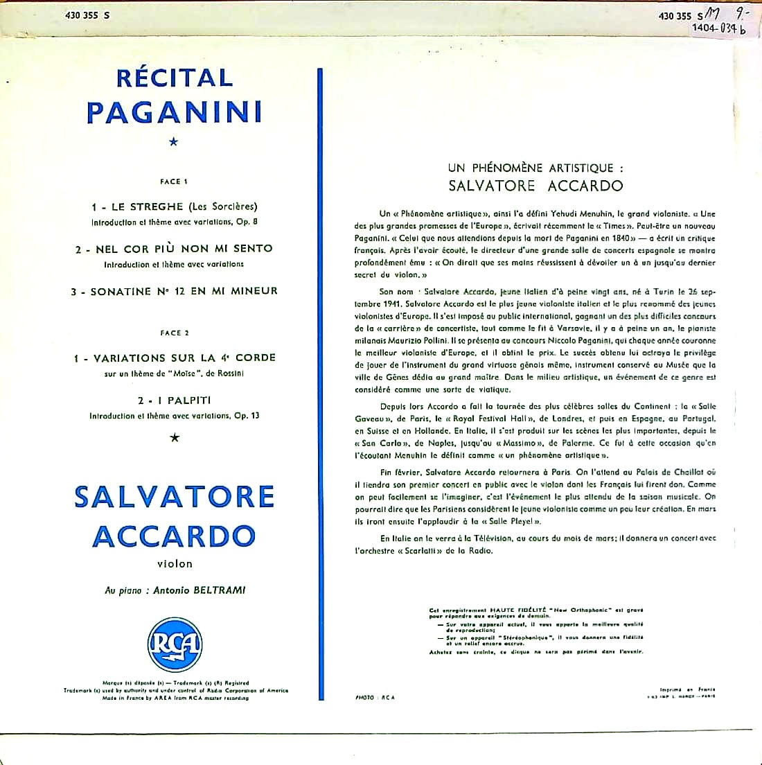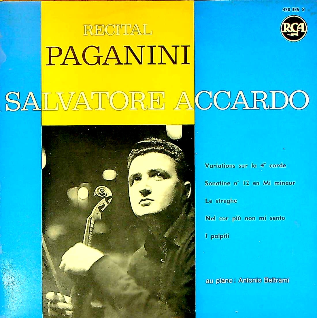 商品詳細:PRETORIAとフランスRCAの両方から出ている「パガニーニ・リサイタル」。アッカルドが、1958年のパガニーニ・コンクールで優勝した後の1959年3月に録音された、彼のデビュー盤である。また数ある彼のレコードの中でも、頂点に輝く演奏であることは勿論のこと、パガニーニのレコードの中でも数指に入る名演である。録音についても、当時のアッカルドの濃密で艶やかな弦の音がうまく録れており、ジャケットに写っている彼の表情と合わせると、ヴァイオリンの醍醐味を堪能できる1枚である。当初1959年にPRETORIA:30CL 8011にて発売され、1963年にフランスRCA:430 355で再版された。PRETORIA盤にはピアニストの名前がクレジットされていない。フランスRCAで再版された際にA.ベルトラーミ(pf)が記載された。実際聴けば確かにピアノ伴奏が申し訳程度に入っているものの、アッカルドのソロ演奏と言って差し支えない程にソロが全面に出た演奏で、アッカルドの超絶技巧を披露する為の録音と言って差し支えない。サルヴァトーレ・アッカルド(1941-)はイタリア生まれのヴァイオリニスト。ナポリのサン・ピエトロ音楽院でルイージ・ダンブロジオに、シエーナのキジアーナ音楽院でジョルジュ・エネスクの高弟だったイヴォンヌ・アストリュクに師事し、さらにナタン・ミルシテインにも師事する。13歳にしてトリエステで最初の演奏会を開いたという神童であった。その後、1955年にヴィオッティ国際音楽コンクールで3位入賞。さらに、1956年にジュネーヴ国際音楽コンクール、1957年イタリア放送の各コンクールで優秀な成績を上げ、1958年のパガニーニ国際コンクールにおいて、17歳の若さで第1位を獲得する。「パガニーニの再来」という賛辞を贈られたほどであった。これがアッカルドのデビュー録音となった。その後1962年にイタリアRCAにパガニーニ「奇想曲全集」を録音し、一世を風靡した。PRETORIAでは当盤を含め3枚のLPを残した。今ではそのどれもが高額盤となっている。イタリアRCAでは1965年まで在籍し、1970年代にDGGへ移籍しパガニーニのVn協奏曲全集を録音、同時期にPHILIPSにも籍を置いた。多くの方はDGG以降の録音でしかご存じないのではないだろうか?アッカルドはDGGの前と後では別の奏者ではないかと疑う程、スタイルが異なる。特にPRETORIAの3枚は異常事態と言えるほどの、前のめりに攻めた演奏で息もつかせない激情的演奏を行う。大人しくなり、普通のヴァイオリニストになった後の録音しか知らない方にはショックを受ける内容である。初出はPRETORIAだがギガ・レア盤で高額!RCAは4年落ちの再版だが充分に良い音質!