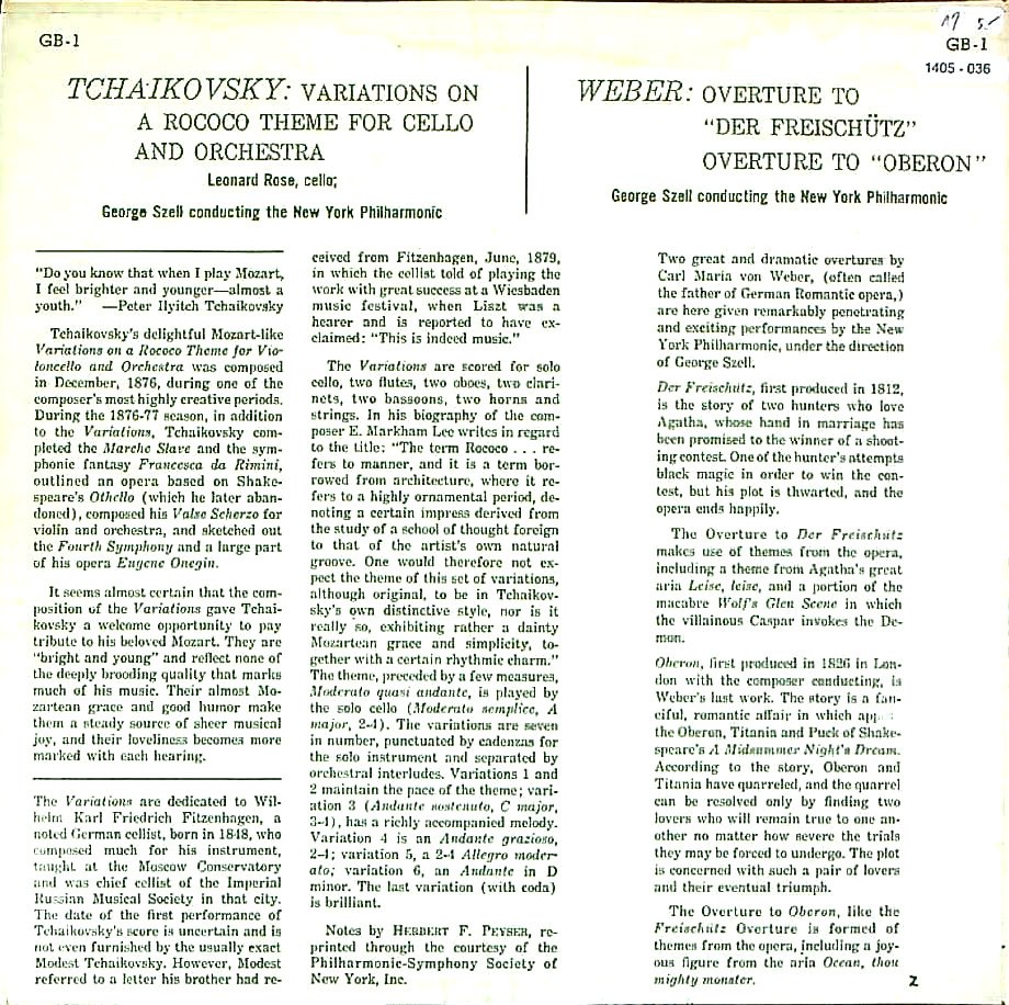 商品コード:1405-036[COLUMBIA] G.セル/ チャイコフスキー:ロココ変奏曲Op.33, ウェーバー:「魔弾の射手」Op.77~序曲, 「オベロン」J. 306~序曲