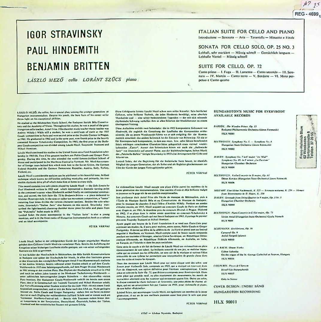 商品コード:REG-4699t[洪HUNGAROTON] L.メゼー(vc)/ ストラヴィンスキー:イタリア組曲, ヒンデミット:無伴奏VcソナタOp.25-3, ブリテン:無伴奏Vc組曲Op.72