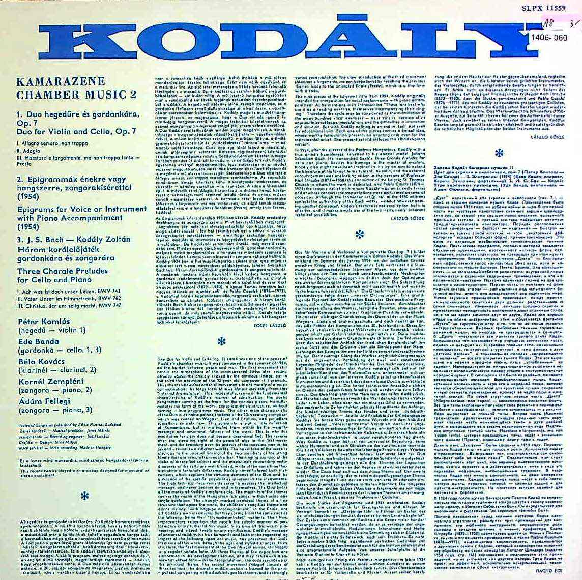 商品コード:1406-060t[HUNGAROTON] P.コムローシュ(vn) E.バンダ(vc) 他/ コダーイ:室内楽曲集Vol.2/2重奏曲Op.7, 組曲「墓碑銘」, バッハ原曲によるコラール前奏曲