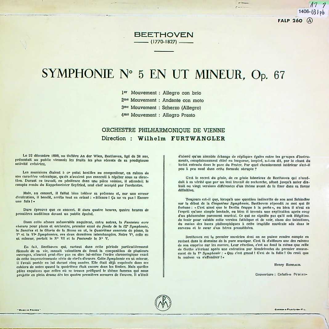 商品詳細:フランスでは1956年頃何故か英国盤をフランス製ジャケットに入れた形でフランス・プレスと同時並行で発売されていた曲がある。このフルトヴェングラー指揮ベートーヴェン:交響曲5番はまさにそのケース。ベートーヴェン:交響曲5番は1954年ウィーンでの録音。仏盤は価格も安いが、その理由はプレス枚数が圧倒的に多いからで、音質が落ちるからではない。やや音が荒いという意見もあるが、その分メリハリがついていることも確かで、こちらを好まれる方も多い。そしてジャケットの面でも、間違いなく仏盤の方がデザインが優れている。フランスにはジャケットが数種あるが、異なるジャケットにも同じ盤が入っているケースが多い。の録音は世界的に有名で非常に多くの国でプレスされた。フルトヴェングラーの代表的な録音の一つ! フランス盤はプレスの種類が非常に多く、年代を反映した価格としている。勿論英国プレスより安価である。英国盤入りのフランス発売分は例外的なケースで多くはない!