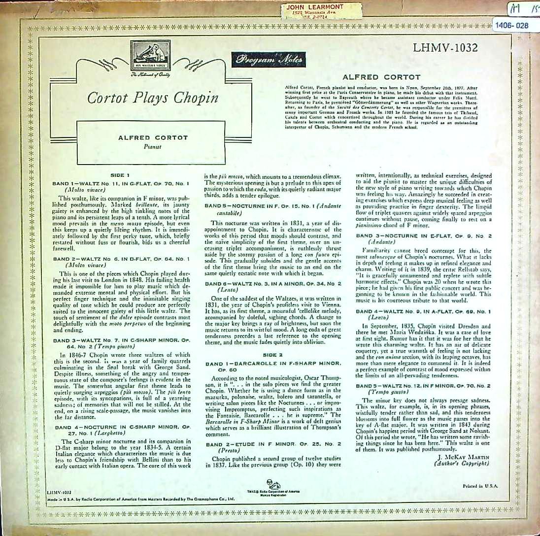商品詳細:米国製作のSP復刻盤と思われる。欧州から同じ内容のLPは発売されていない。当LPの一部はSP復刻ではなく1951年10月のモノラルLP録音(舟歌 Op.60など)らしい。その1951年10月録音の舟歌のLPは英国には存在せず、この米国盤が唯一のLPの可能性がある。おそらくこのLHMV 1032でしかLPで聴けない曲が複数あると思われる。音質は悪くない。これまで欧州発売のLPをお持ちの方にこそ注目してほしい米国盤である。当社初入荷の希少タイトル!コルトー好きの方に是非1曲ごとにじっくりと調べていただきたい内容!