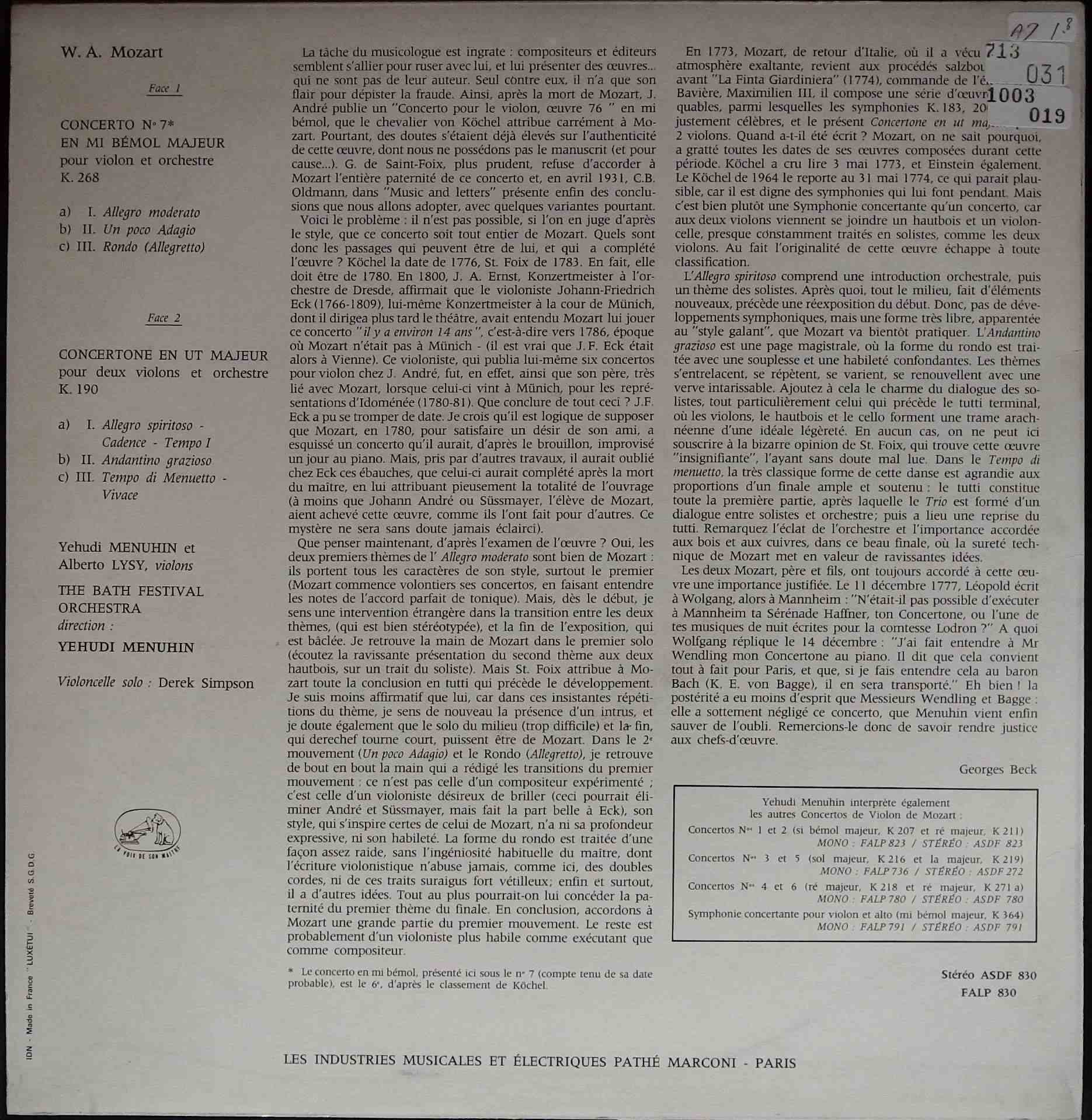 商品コード:1003-019[La Voix De Son Maître] モーツァルト:Vn協 7番 コンチェルトーネK.190 Y.メニューイン(vn) バース祝祭o.