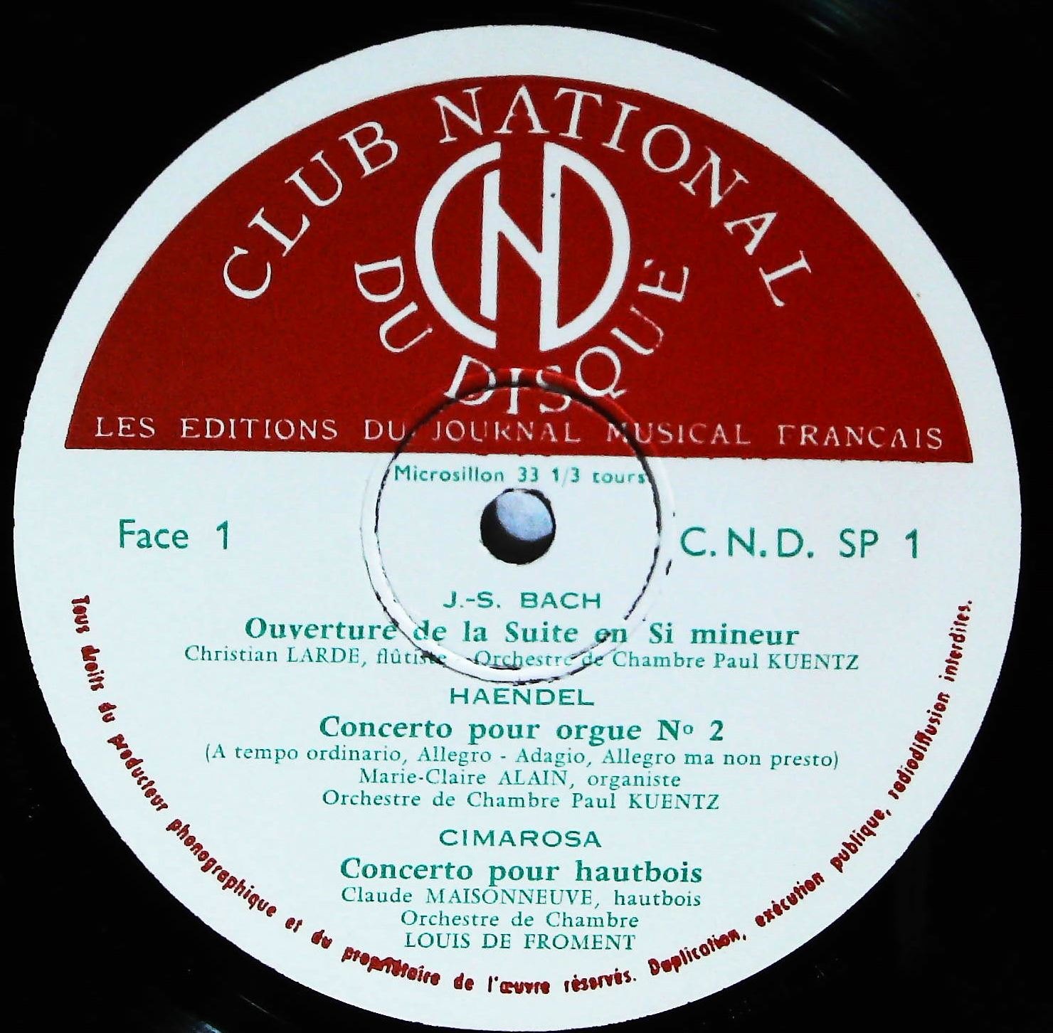 商品詳細:CLUB NATIONAL DU DISQUEの社屋がまだルーヴル通り33番地にあった時代の古いLP。番号にSP1と付くように特別な企画盤。オムニバスと呼ばれる寄せ集めだが当時としてはこのタイプが売れたのだろう。新人の給料1か月分したらしい。良いところだけ沢山聴きたいのが人情だろう。このLP発売までの既録音から美味しいところを7曲分集めたもの。今の時代の人には不人気のスタイルではあるがCNDのトップ・アイテムばかりである。きっちりバッハが先頭に来る作曲家のランクは当時から変わらないようだ。ランジュサンのショパンの練習「木枯らし」で締めくくられる。P.キュンサはこのレーベル発足時からの看板指揮者。奇を衒はないドイツ風の安定感がバッハの厳粛な雰囲気を作り出す。ジュスマンのモーツァルトの歌曲が1曲「寂しい森の中で」があり、エルフェのベートーヴェン・ソナタと変化に富む。今見ても贅沢な内容。