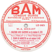 商品詳細:録音は1960年前後としか不明。ステレオも5065という番号でほぼ同時に発売された。今回はより音の濃厚なモノラルを使う。パスキエ・トリオといえば、1927年設立のSP時代から活躍するフランスの3人兄弟による弦楽トリオ。1930〜60年代までに多くの名演を残したことで知られる。Vaのピエールの息子達は新パスキエ・トリオを結成し、彼等の名を後世に伝えている。パスキエ・トリオは1960年頃に仏BAMレーベルに2枚のモーツァルトを残し、どちらも傑作として人気が高い。これはその1つ。ソリストにピエルロ(ob)を迎えたK.370、ラクロワ(pf)を迎えたPfトリオK.542と小品K.442。これら名室内楽は、すでに1960年頃には名演が出尽くしており、ステレオ期においては一部の名録音の影を追いかけているに過ぎないという現状が理解されつつある。しかし、それを2000年以後に発売されたCDに求めても無駄なことも周知の事実である。果して、その名演の本体とはどんなものであろうか。一言で言うならば、アロマであろう。1杯200円のコーヒーと1,200円のコーヒーの最大の違いは、味も当然ながらアロマであることは明らかだ。彼等の演奏にはそのアロマが漂っている。それを引き出すのはオリジナルLPと正しい再生なのだが、誰にでも可能ではない。ここにフレンチ・カフェ又はコニャックのようなアロマが皆様に伝わることを祈る。特筆すべきキズは無い。