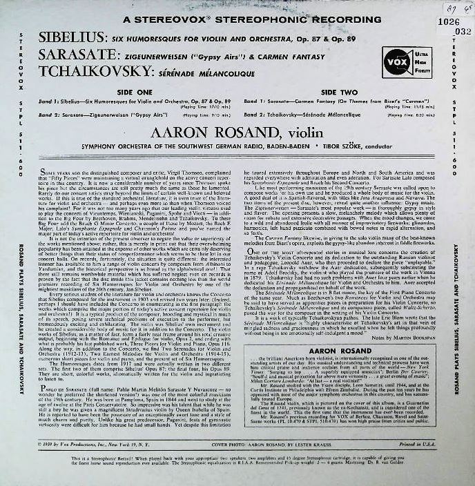 商品詳細:アーロン・ロザンドは1927年アメリカ生まれ。1950年代初期モノラル期からVOXなどに録音を多数残すが日本でブレイクしたのは1990年後半になってから。丁度そのころ頻繁に来日し日本人の多くのファンと交流を持つ。小さな田舎町にでも気がねなく出かけ当地のファンの希望があれば小さな演奏会でも厭うことなく精力的に開催していた。ロザンドはカーティス音楽院でアウアーの弟子E.ジンバリストに師事。フランコ=ベルギー派とロシア派の両奏法に通じる。ミルシテインとも近いスタイル。2009年彼の所有するグァルネリ・「エクス・コハンスキ」が約10億円でロシアの富豪に売却されたと「ニューヨーク・タイムズ」に載った。母校カーティス音楽院へ寄付したらしい。彼はずっとこの楽器を使っており、当LPもそれで録音された。ソロのエネルギーが圧巻、音色も美しく欧州系の奏者と何ら変わるところはない。