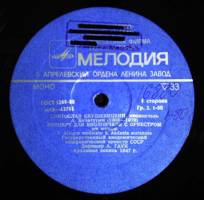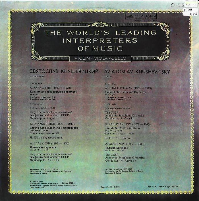 商品コード:1029-074n[露MELODIYA] S.クヌシェヴィツキー(vc)/ハチャトゥリアン:Vc協奏曲, ラフマニノフ:Vcソナタ, グラズノフ:スペイン・セレナーデ