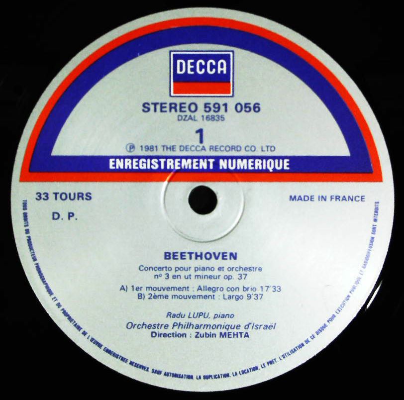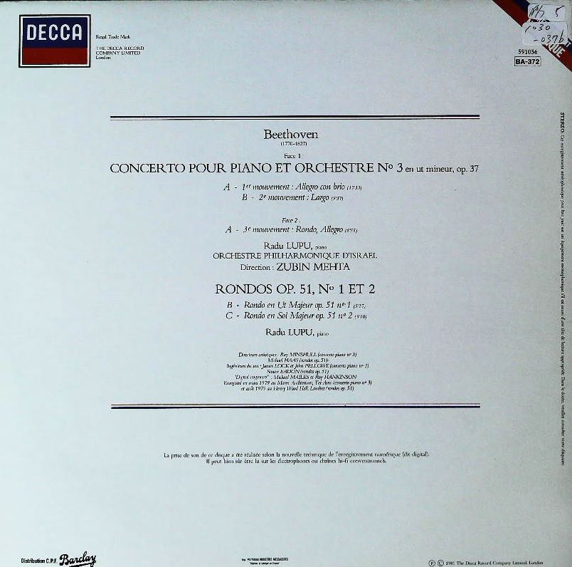 商品コード:1030-037b[DECCA] R.ルプ(pf) Z.メータ指揮イスラエルpo./ベートーヴェン:Pf協奏曲3番, 2つのロンド