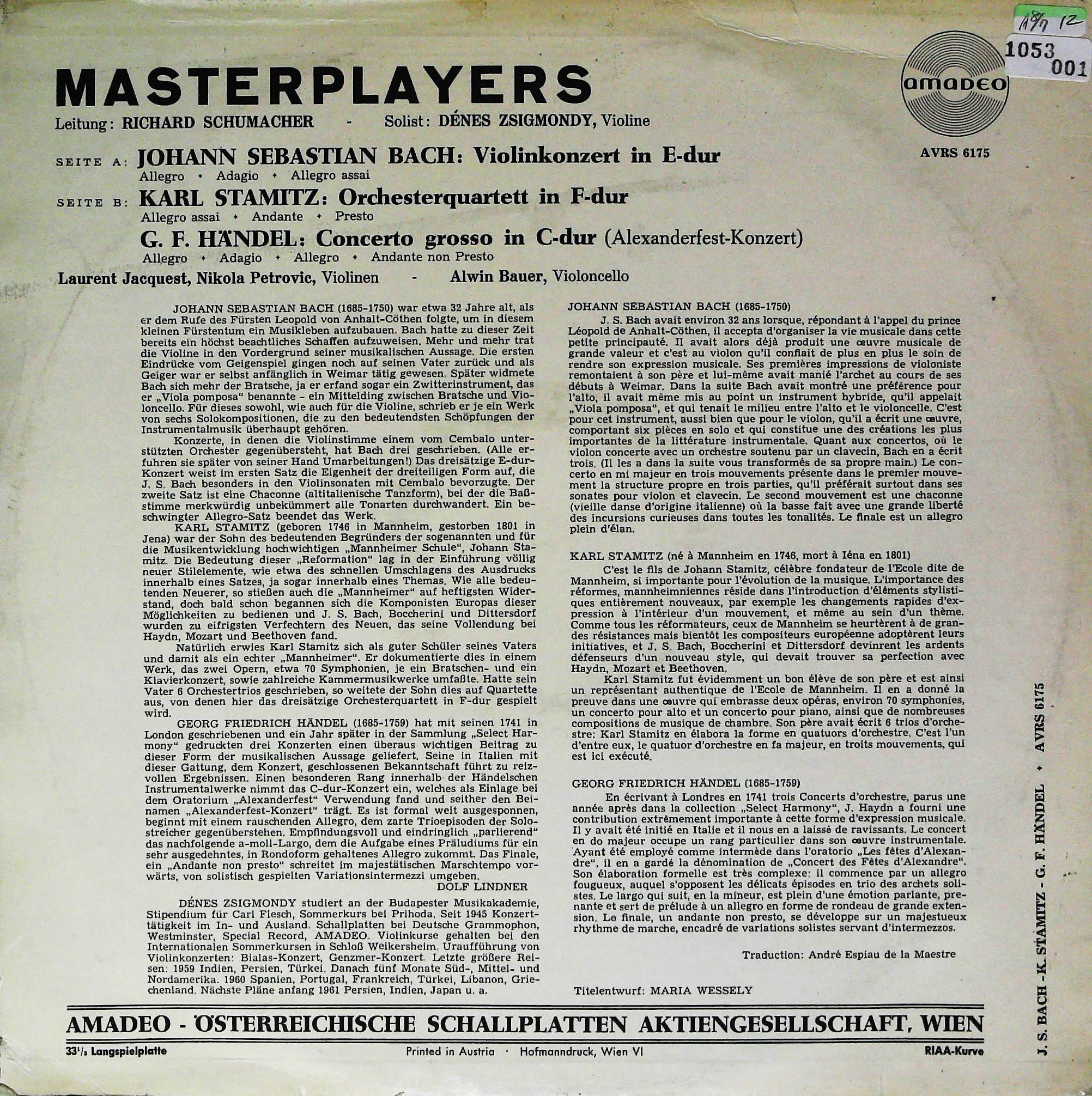 商品コード:1053-001p[AMADEO] 「マスタープレイヤーズ」/D.ツィグモンディ(vn) R.シューマッハ指揮 L.ジャック/N.ペトロヴィツ(vn) A.バウエル(vc)/バッハ, シュターミッツ, ヘンデル