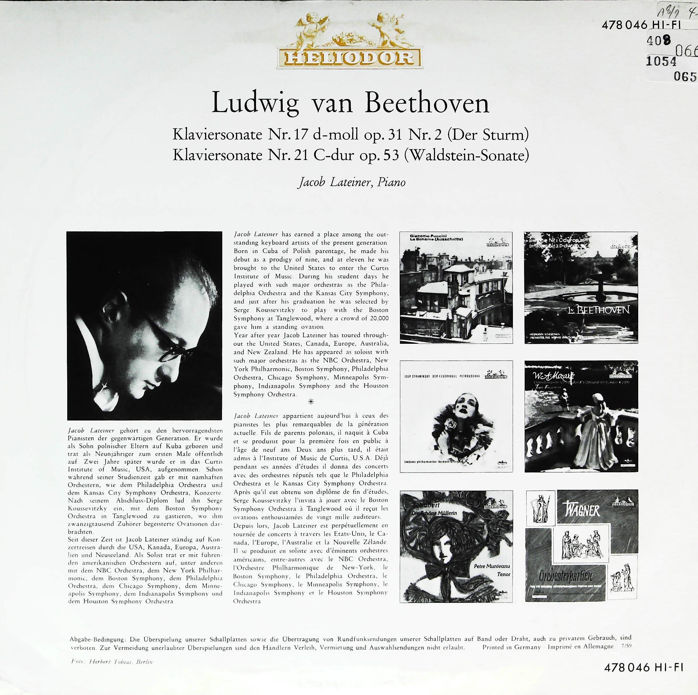 商品コード:1054-065[HELIODOR] J.ラテイナー(pf)/ベートーヴェン:Pfソナタ17番「テンペスト」, Pfソナタ21番「ワルトシュタイン」