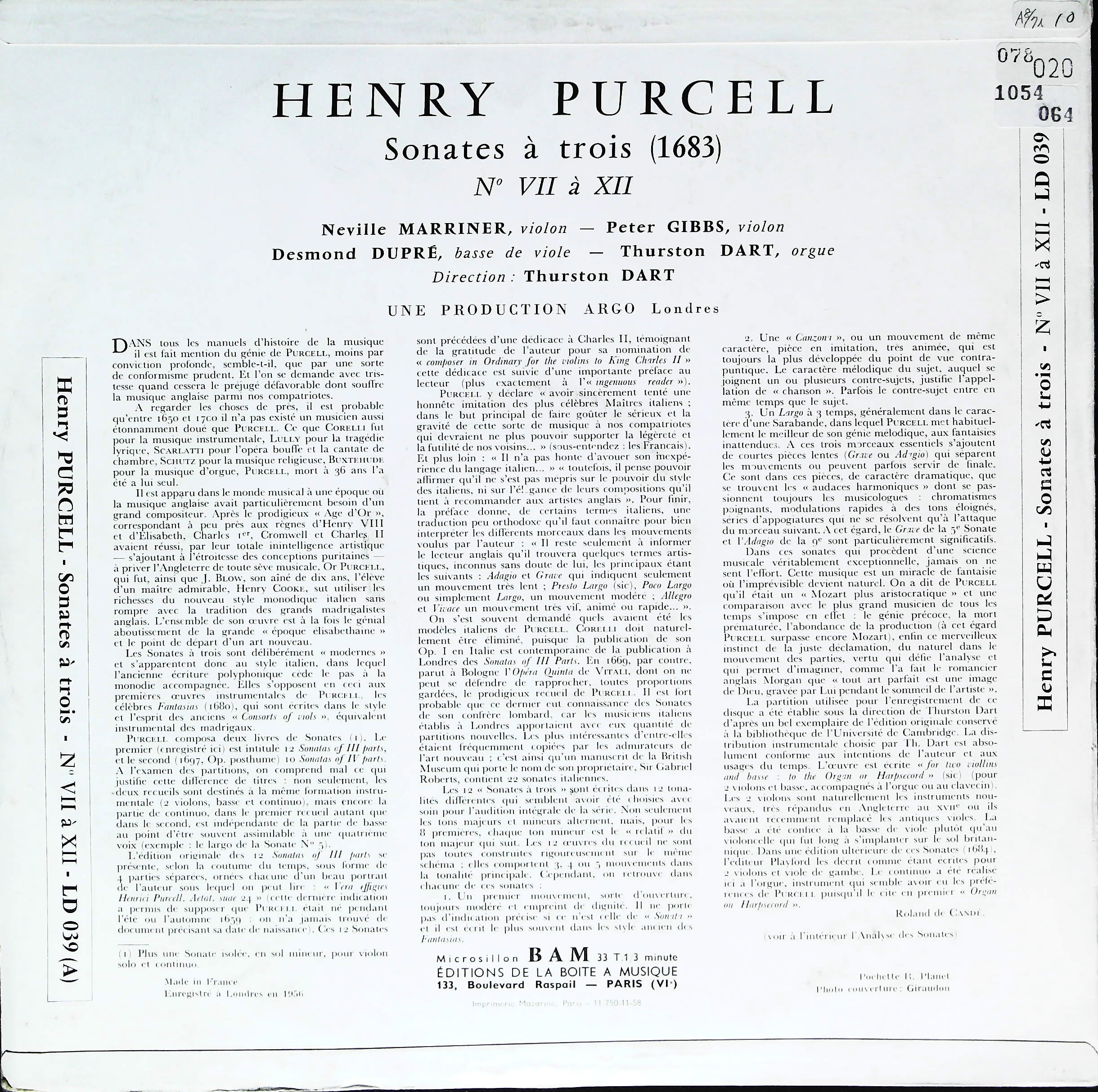 商品詳細:フィルハーモニア管やロンドン響のヴァイオリニストを務めたマリナーが、サーストン・ダートと共に結成した「ジャコビアン・アンサンブル」によるパーセルの曲集。コンティヌオはダートのオルガンによる。楽器はストラディヴァリを始め、すべてオリジナル楽器が使われていて、いい意味で学究的な演奏だが、パーセルの器楽曲として最上のものと言えるだろう。印象的な旋律で聴かせる曲ではなく、三声の扱いの妙が持ち味なので、このようなスタイルはいつになっても不滅だ。英ARGO/RG 84-5(バラ2枚)が音源。パーセルの室内楽にはトリオ・ソナタ形式で12曲の3声のソナタ集と10曲の4声のソナタ集がある。録音は3声のソナタ集全12曲で初の全曲録音と思われる。今見ると英国屈指のすごいメンバーが集う。マリナーが一介のヴァイオリニストとして登場。バラ2枚で完結、これはそのVol.2.