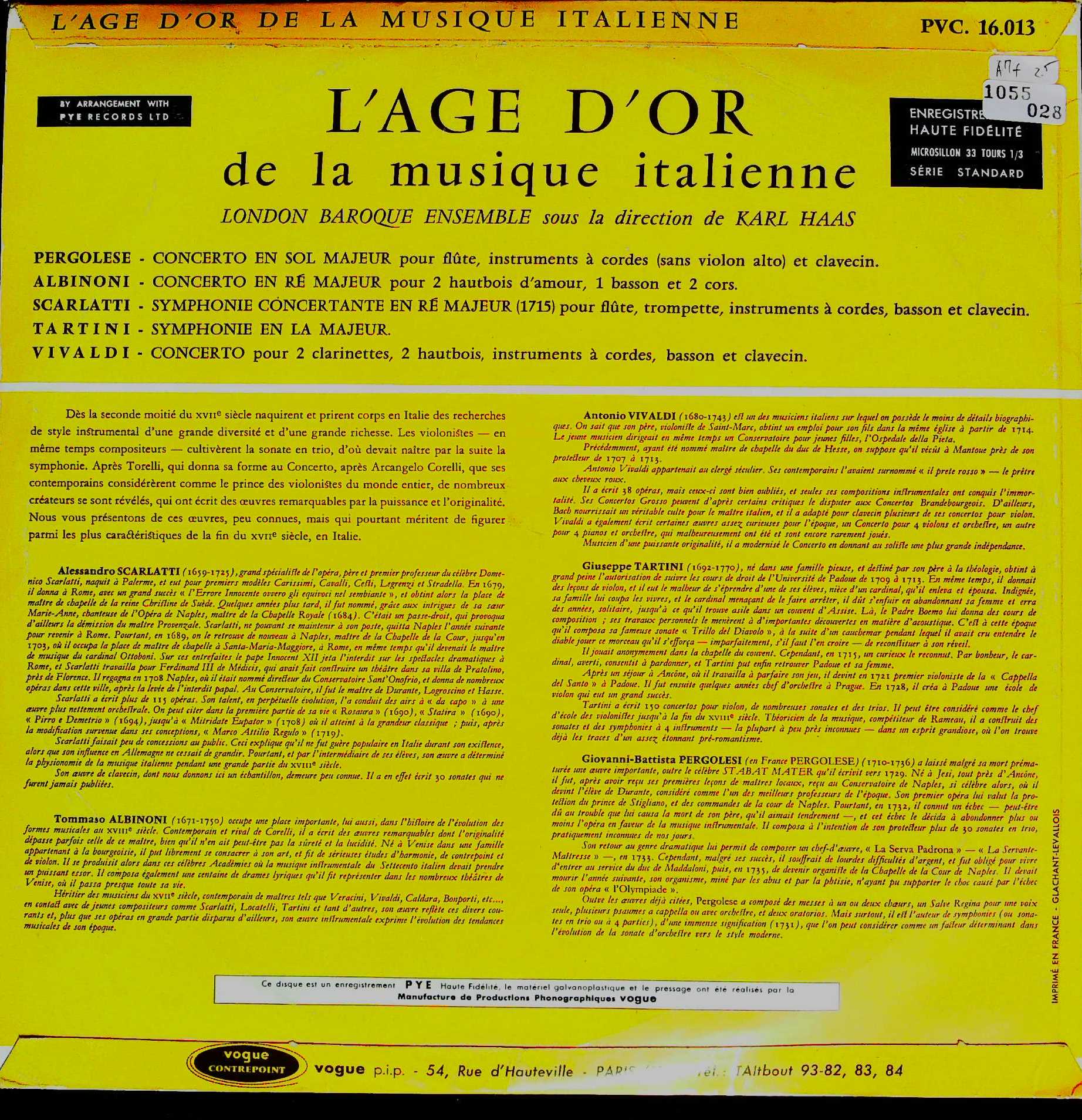 商品詳細:Vogue系列の小レーベルには似たようなタイトルの録音が多いがこれは英国PYEレーベルが音源のフランスプレスと思われる。指揮者カール・ハース(1900-1970)はドイツのカールスルーエのユダヤ人家庭に生まれる。ナチスのユダヤ迫害を逃れて、彼はオールドヴィックの音楽監督として1939年に英国ブリストルに移住した。元々ヴィオラ・ダモーレの奏者でチェルビーニ、ボッケリーニ、ディッタースドルフ、ヘンデル、ハイドンなどの作品編集の仕事をしていた。1941年に彼はロンドンでロンドン・バロックアンサンブルを創設し、1966年まで続いた。あのデニス・ブレインもここのメンバー。他J.ブライマー、ド・ペイエ、G.マルコムなど名だたるメンバーが名を連ねた英国屈指の団体であった。あのWESTMINSTERも例外的に英国まで録音チームを送りブランデンブルク協奏曲やモーツァルトなどもを録音した。1970年ロンドンで没。これはイタリア・バロック作品集として5曲がモノラル録音された。英国のバロック演奏の創成期を作った歴史的な録音。非常に音質が良く、さすがにソリストたちの演奏はどれも名人級!
