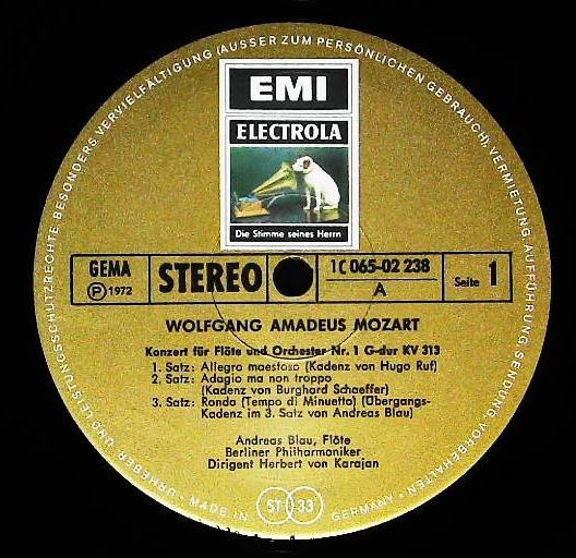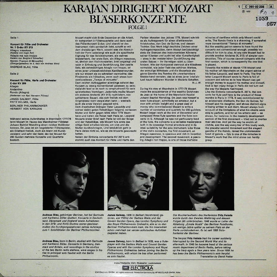 商品コード:1059-067[ELECTROLA] J.ゴールウェイ(fl) F.ヘルミス(hp) H.v.カラヤン指揮ベルリンpo./モーツァルト:Fl協奏曲1番K.313, Fl・Hp協奏曲K.299