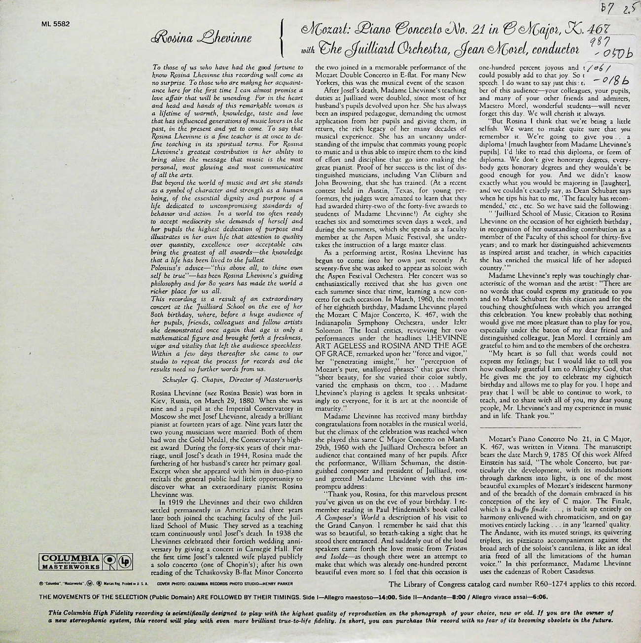 商品コード:1061-018b[Columbia] R.レヴィーン(pf) J.モレル指揮ジュリアードo./モーツァルト:Pf協奏曲21番K.467