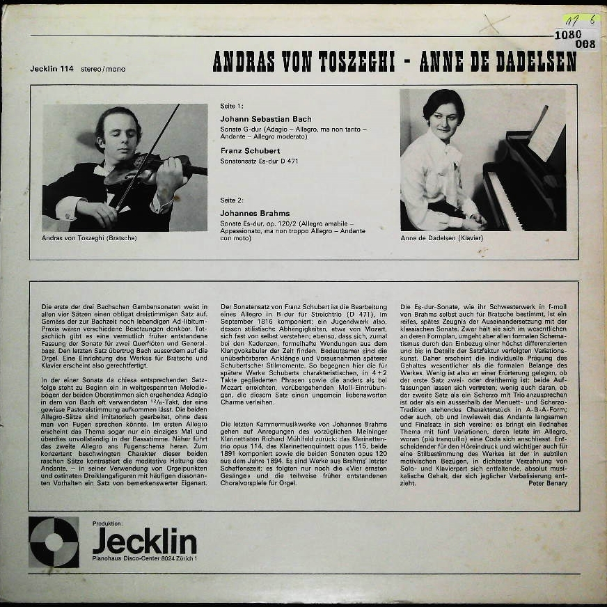 商品コード:1080-008n[JECKLIN] A.v.トーセギ(va) A.D.ダデルセン(pf)/Va作品集/バッハ, シューベルト, ブラームス