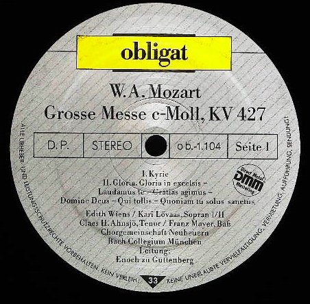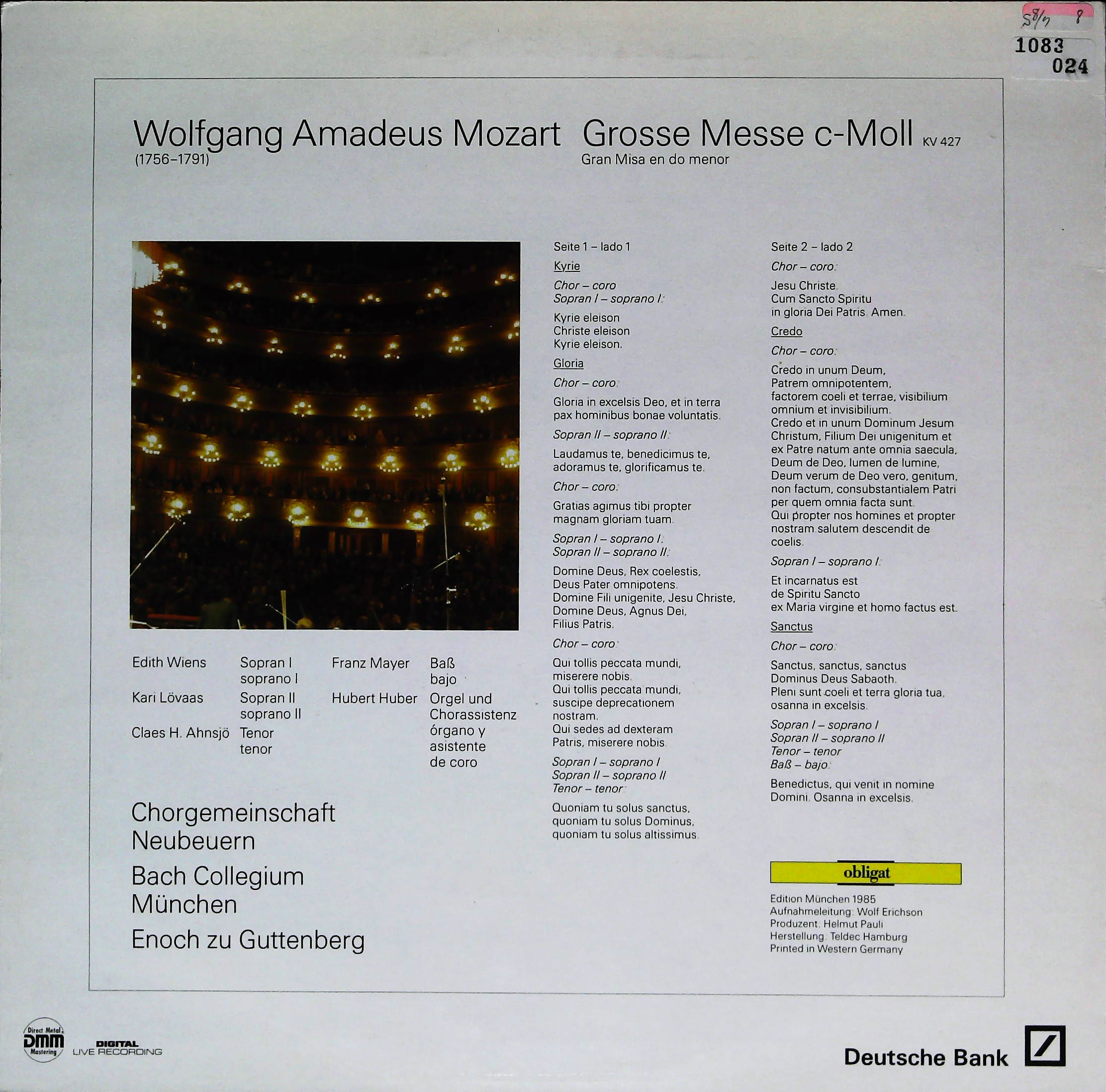 商品コード:1083-024t[OBLIGAT] E.z.グーテンベルク指揮ミュンヘン・バッハ・コレギウム ノイバウエルcho. E.ヴィーンズ(s) 他/モーツァルト:大ミサ曲