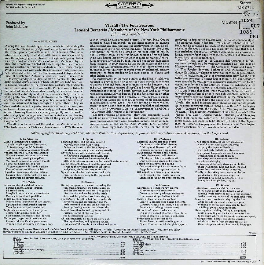 商品コード:1085-061[Columbia] J.コリリアーノ(vn) L.バーンスタイン指揮ニューヨークpo./ヴィヴァルディ:Vn協奏曲集「四季」