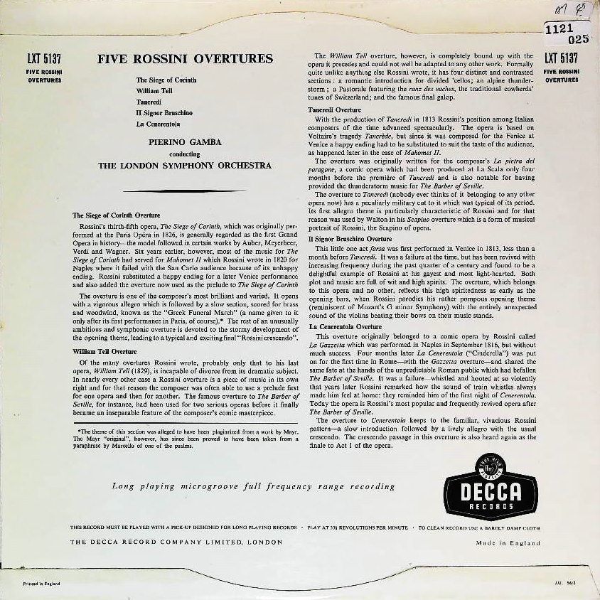 商品コード:1121-025[DECCA] P.ガンバ指揮ロンドンso./ロッシーニ:序曲集/「コリントの包囲」, 「ウィリアム・テル」, 「タンクレディ」, 「ブルスキーノ氏」, 「チェネレントラ」