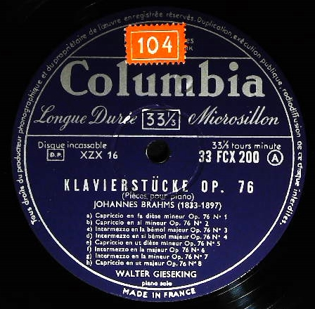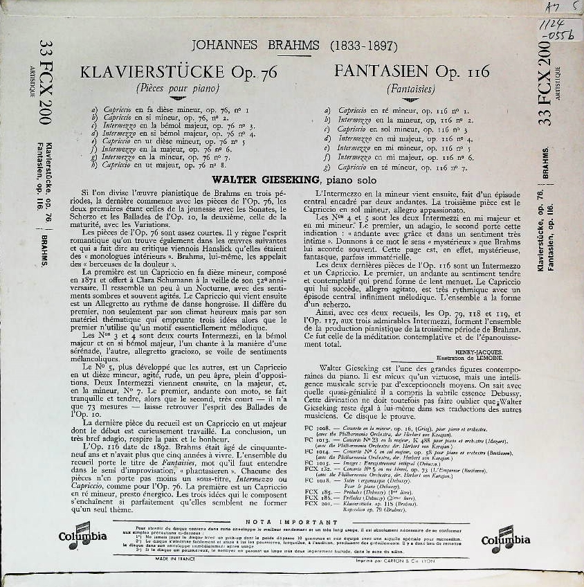 商品コード:1124-055b[COLUMBIA] W.ギーゼキング(pf)/ブラームス:8つの小品, 幻想曲集(全7曲)
