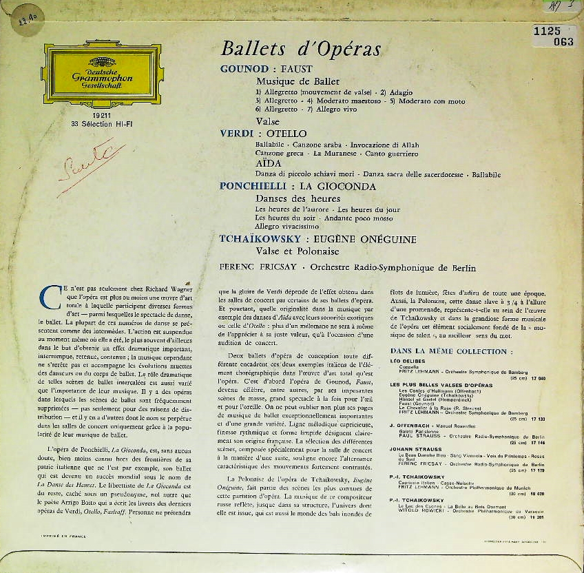 商品コード:1125-063p[DGG] F.フリッチャイ指揮ベルリン放送so.(旧RIAS so)/オペラのバレエ音楽集/グノー:歌劇ファウスト, ヴェルディ:歌劇「オテロ」~バレエ音楽 他