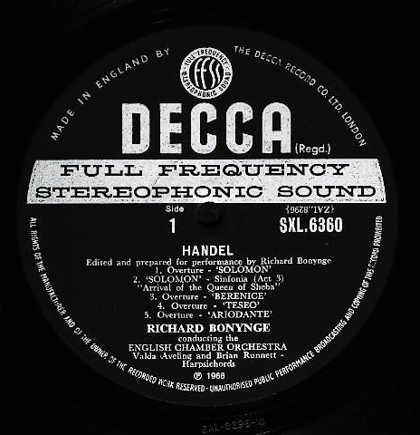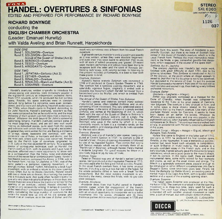 商品コード:1126-037[DECCA] R.ボニング指揮イギリス室内o./ヘンデル:序曲・管弦楽曲集/歌劇「ソロモン」~序曲, 同第3幕のシンフォニア 他