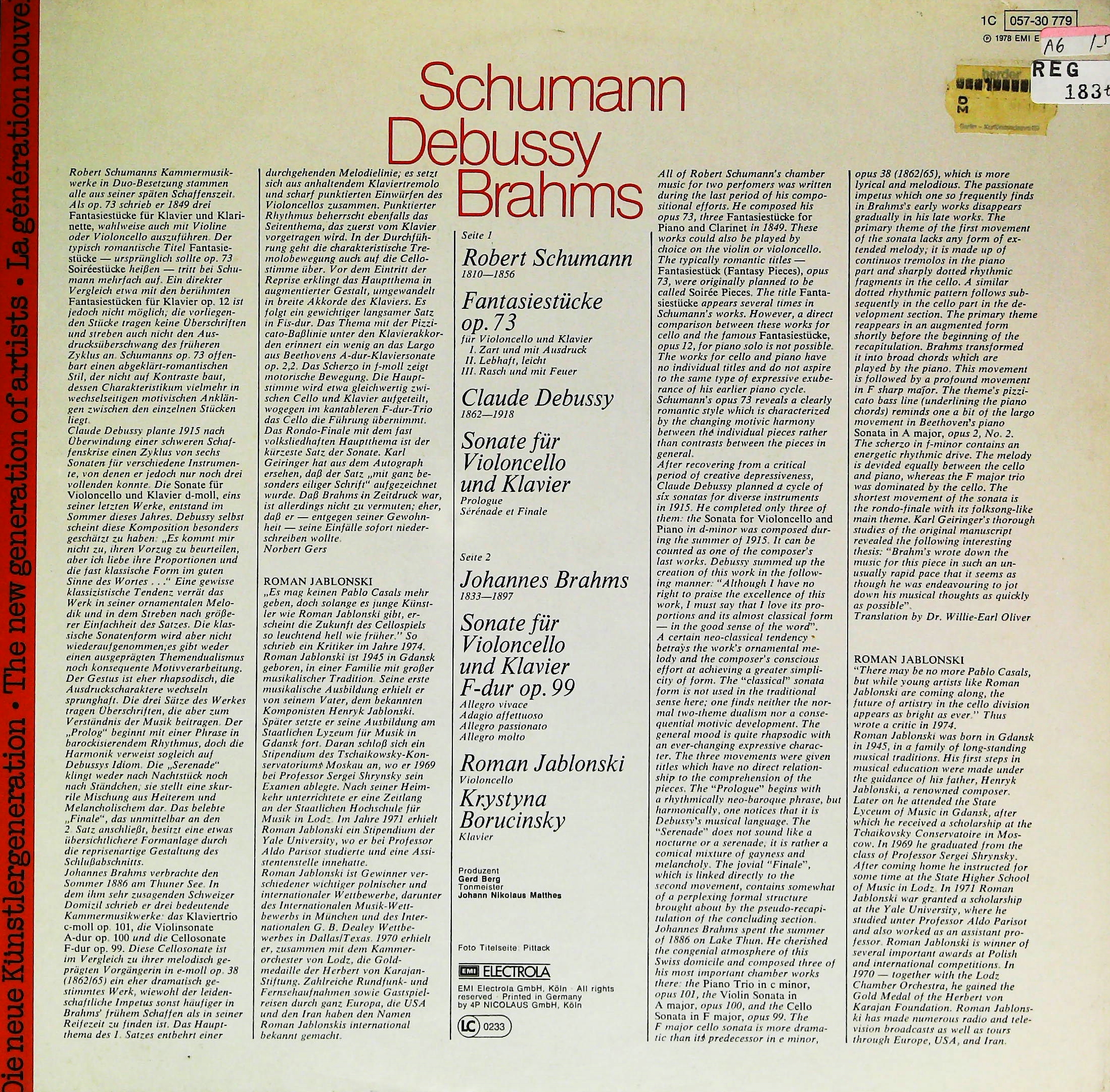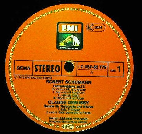 商品コード:REG-183t[独ELECTROLA] R.ヤブウォニスキ(vc) K.ボルチニスカ(pf) / シューマン:VcとPfのための幻想小曲集, ドビュッシー:Vcソナタ, ブラームス:Vcソナタ2番