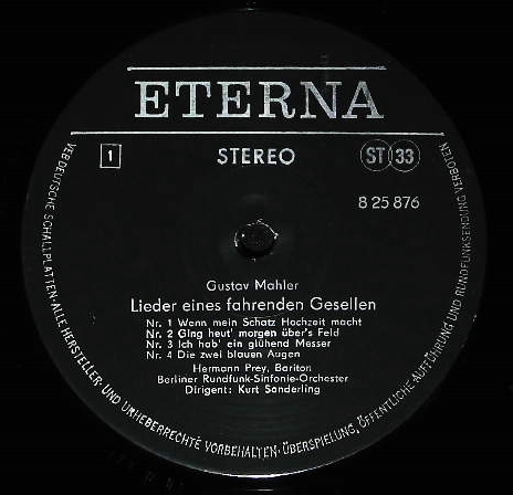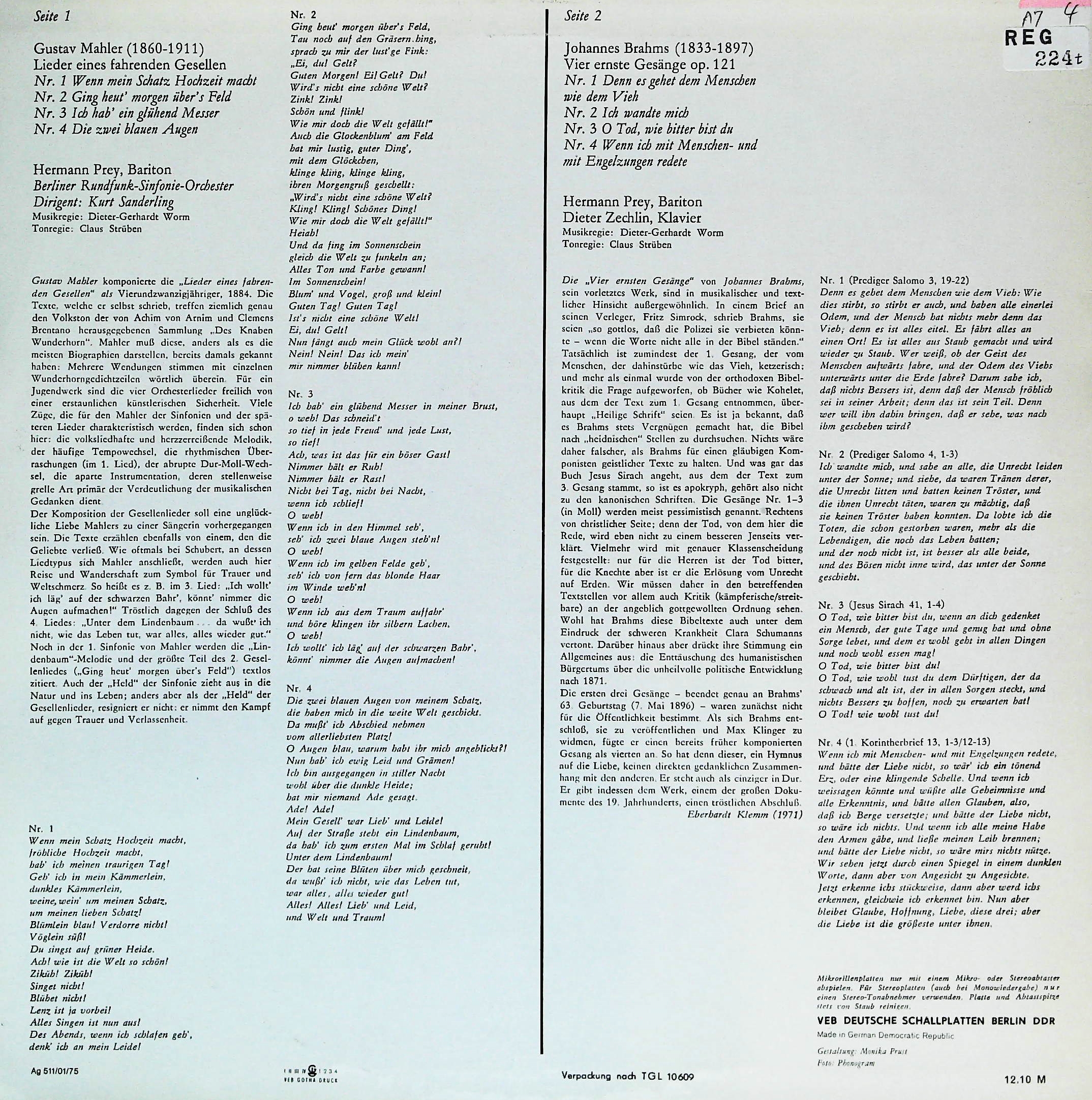 商品コード:REG-224t[東独ETERNA] H.プライ(br) K.ザンデルリング指揮ベルリン放送so. D.ツェヒリン(pf) / マーラー:さすらう若人の歌, ブラームス:4つの厳粛な歌