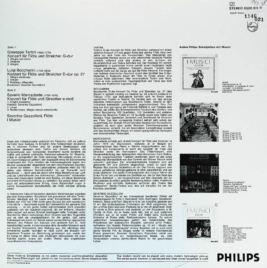商品コード:1146-021[PHILIPS] S.ガッゼローニ(fl) イ・ムジチ合奏団/イタリア・バロック協奏曲集/タルティーニ, ボッケリーニ, メルカダンテ