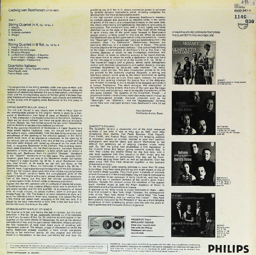 商品コード:1146-030[PHILIPS] イタリアQt./ベートーヴェン:弦楽四重奏曲5, 6番