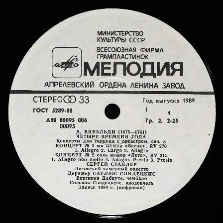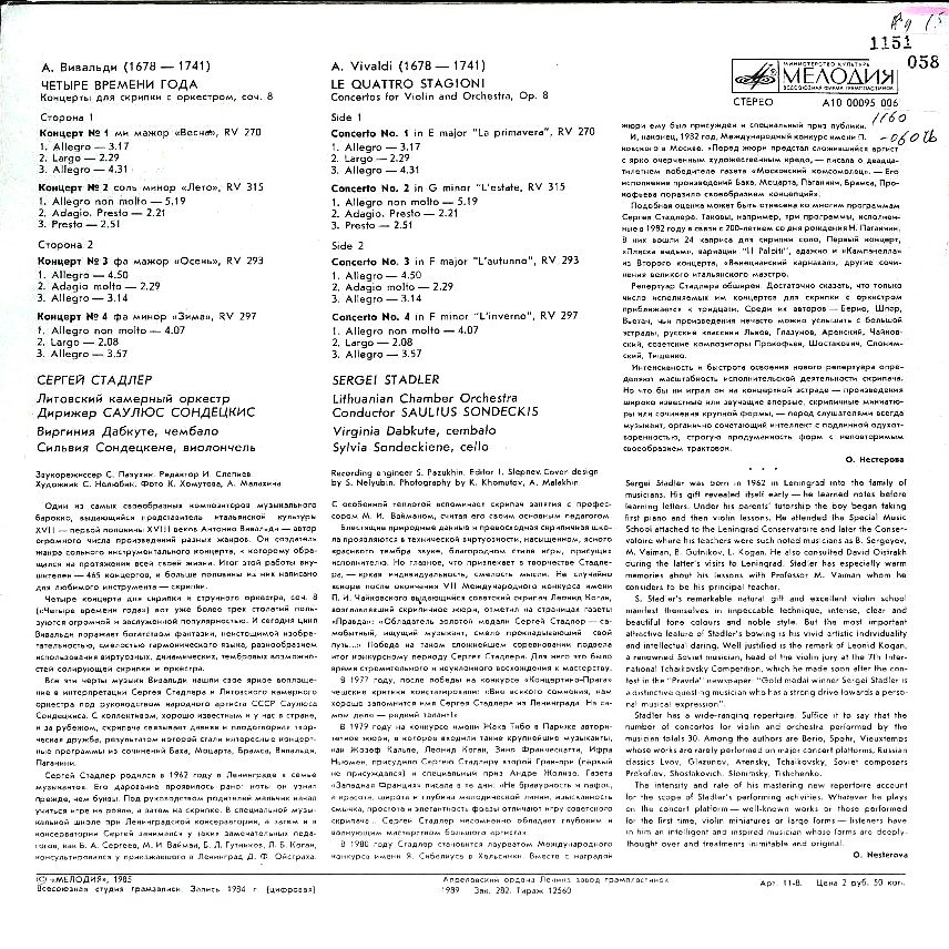 商品コード:1160-060tb[MELODIYA] S.シュタードラー(vn) S.ソンデツキス指揮リトアニア室内o. / ヴィヴァルディ:四季(Op.8-1~4)