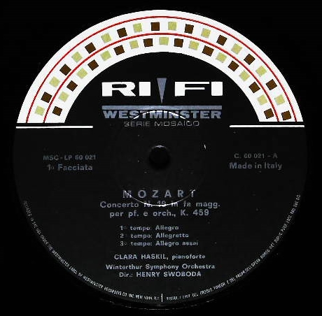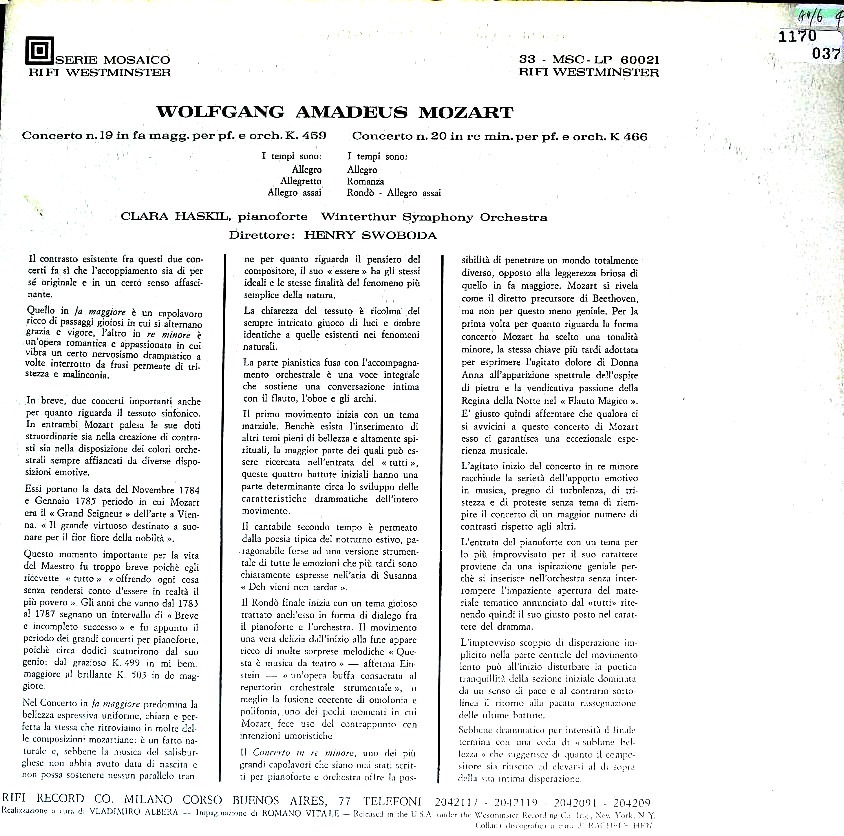 商品コード:1170-037p[RIFI RECORD] C.ハスキル(pf) H.スヴォボダ指揮ウィンタートゥールso. / モーツァルト:Pf協奏曲19番K.459, Pf協奏曲20番K.466