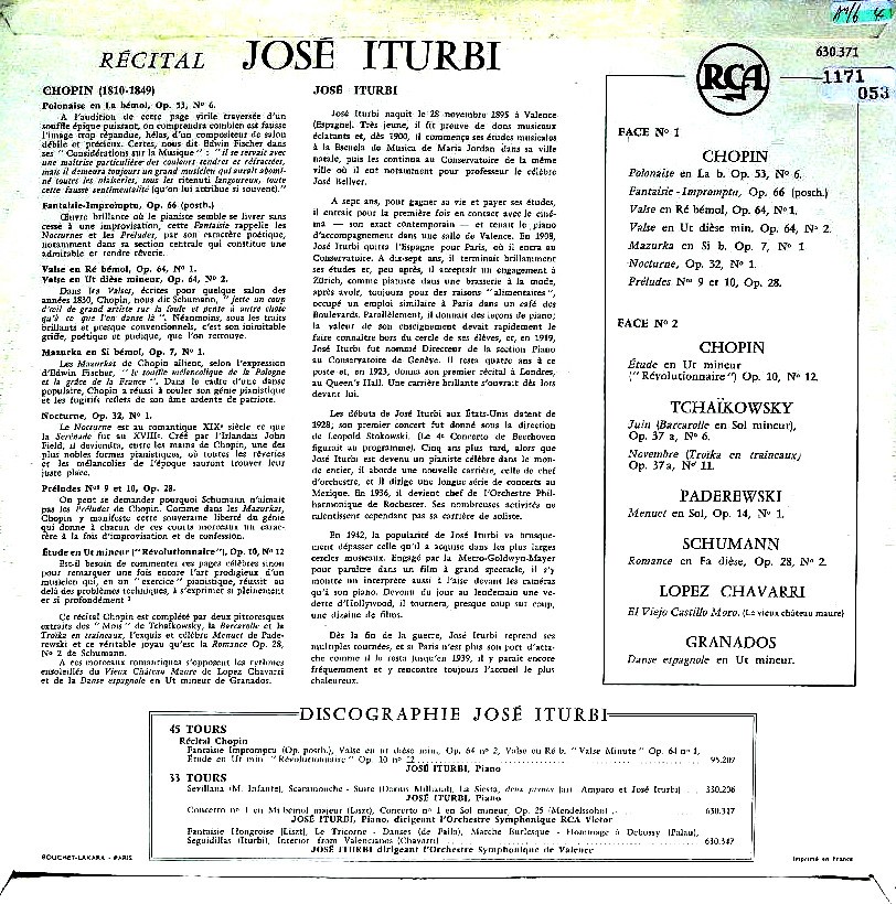 商品コード:1171-053p[RCA] J.イトゥルビ(pf) / 「Pf名曲集」ショパン, チャイコフスキー, パデレフスキ, シューマン, チャバリ, グラナドス, 全14曲