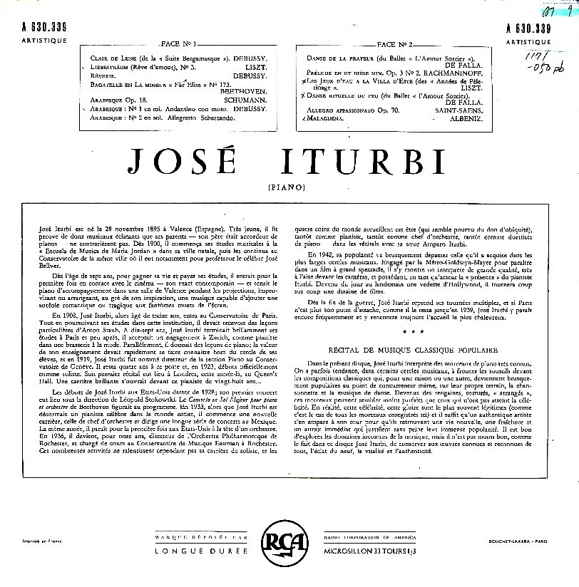 商品コード:1171-050pb[RCA] J.イトゥルビ(pf) / Pfリサイタル/月の光, 愛の夢, アラベスク(シューマン, ドビュッシー), 恐怖の踊り, マラゲーニャ, エリーゼのために, 他