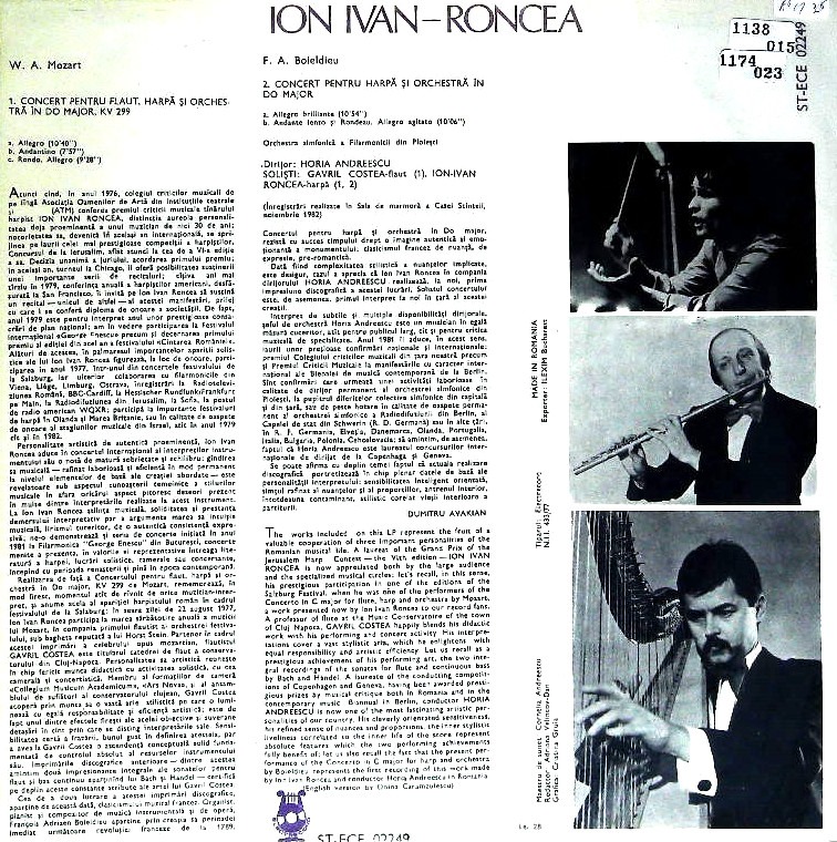 商品コード:1174-023[Electrecord] G.コステア(fl) I.イヴァン・ロンセア(hp) H.アンドレースク指揮プロイェシュティpo. / モーツァルト:Fl, Hp協奏曲, ボイエルデュー:Hp協奏曲