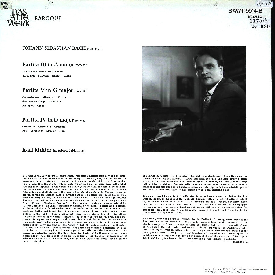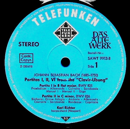 商品コード:1175-020[TELEFUNKEN] K.リヒター(cemb) / バッハ:バッハ:6つのパルティータB.825~830