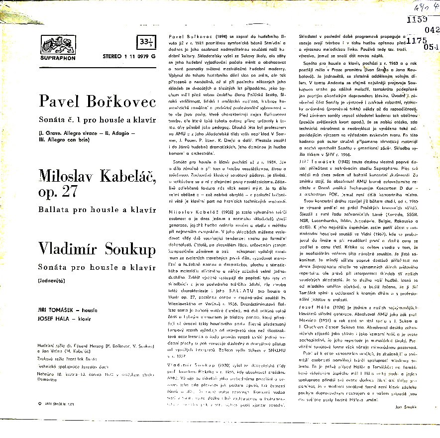 商品コード:1175-054[SUPRAPHON] J.トマシェク(vn) J.ハーラ(pf) / チェコの近代Vn作品/パヴェル・ボシュコヴェツ, ミロスラフ・カベラーチ, オンドジェイ・ソウクプ