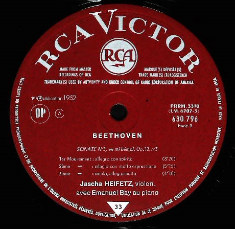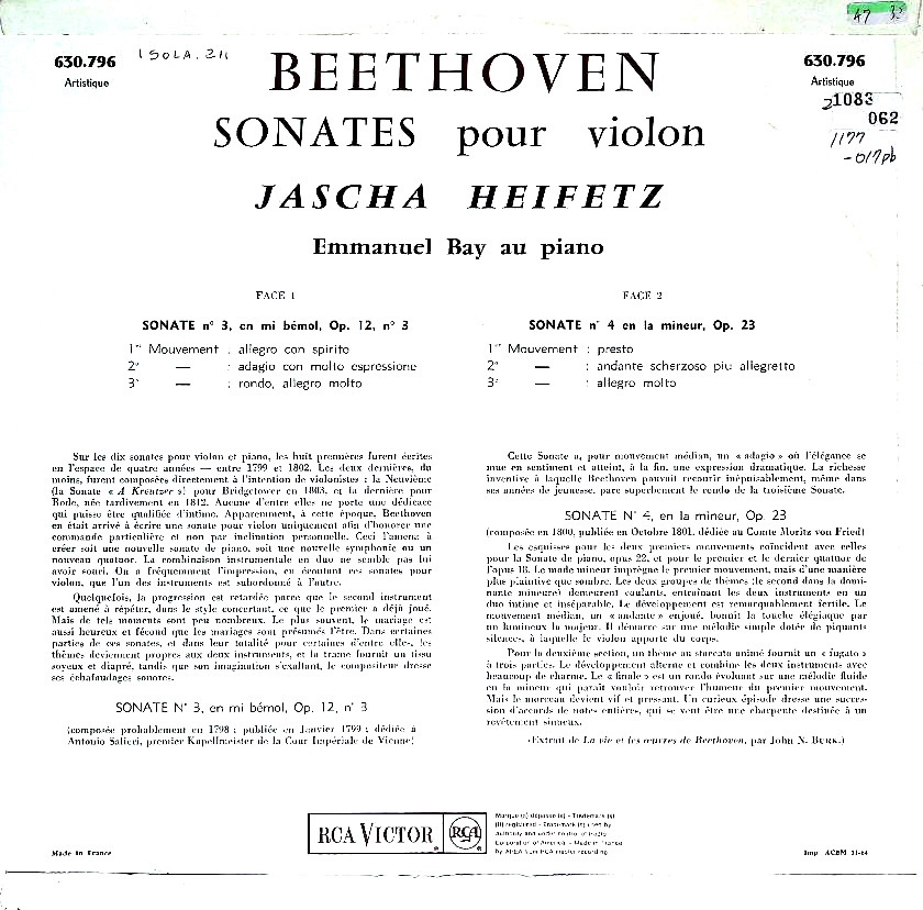商品コード:1177-017pb[RCA] J.ハイフェッツ(vn) E.ベイ(pf) / ベートーヴェン:Vnソナタ3番Op.12-3, Vnソナタ4番Op.23