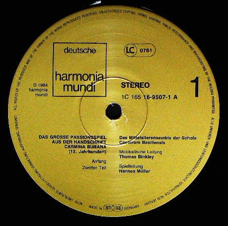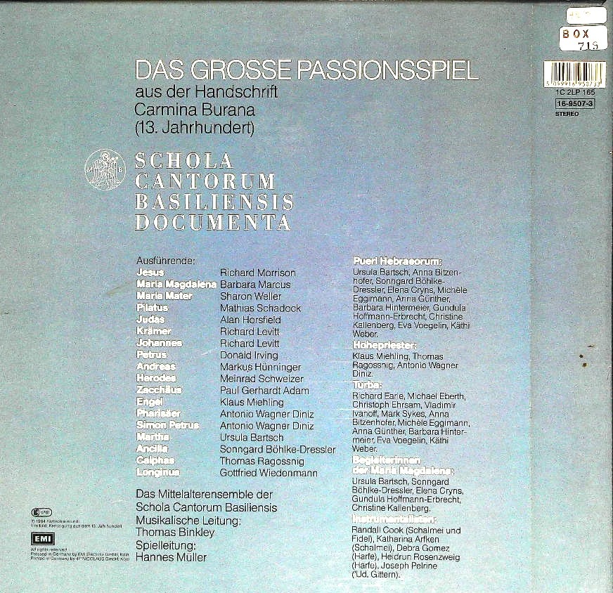 商品コード:BOX-719[独Harmonia Mundi] T.ビンクリー指揮バーゼル・スコラ・カントルムの中世Ens., R.モリソン, B.マーカス, 他 / カルミナ・ブラーナ(偉大なる大受難劇)