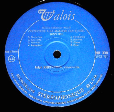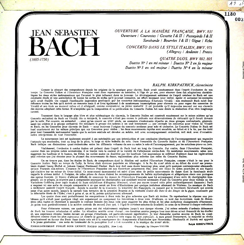 商品コード:1180-003[VALOIS] R.カークパトリック(cemb) / バッハ:フランス風序曲, イタリア協奏曲, 4つのデュエット